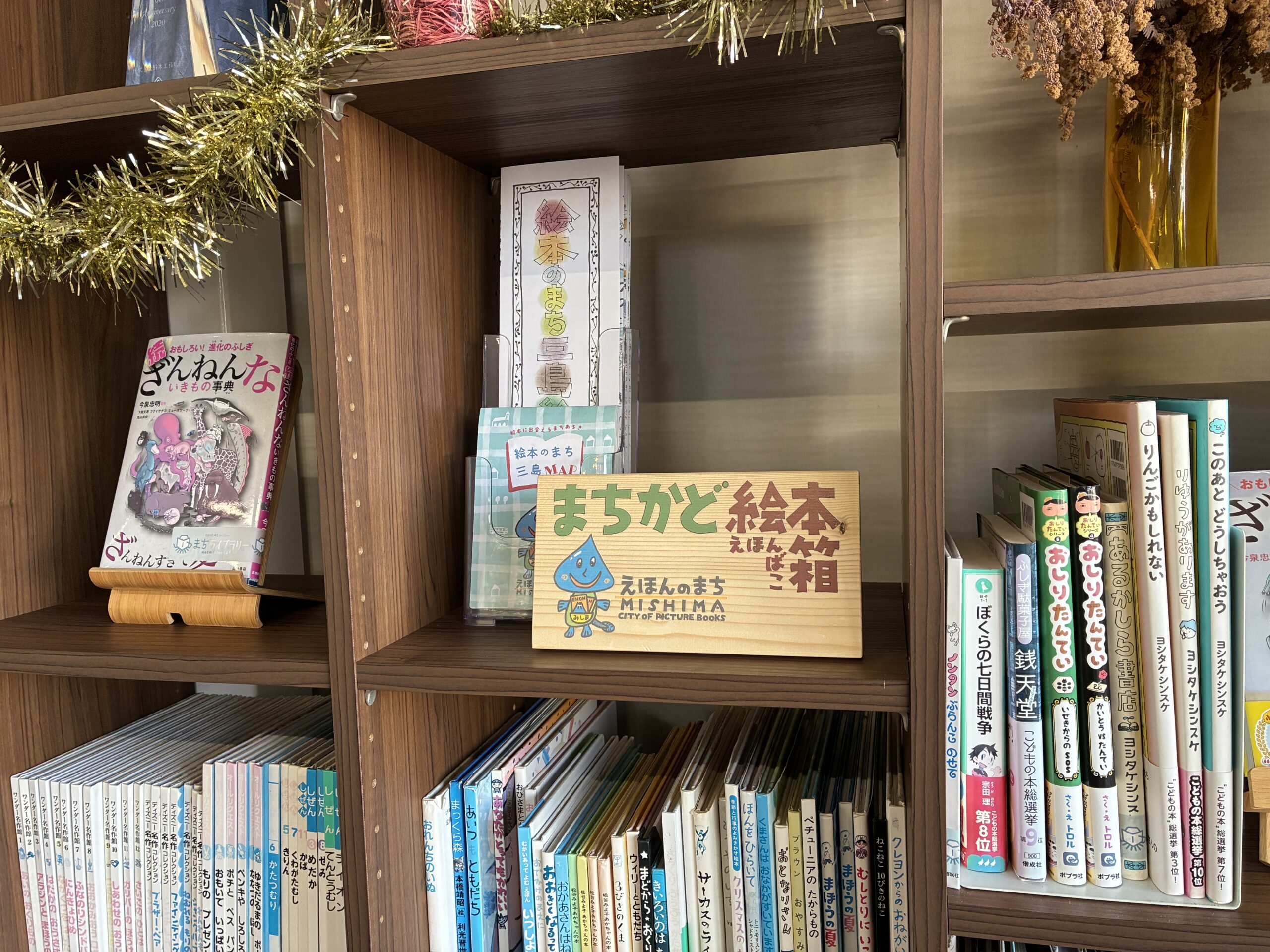 まちかど絵本箱は、地域の子どもたちがいつでも気軽に絵本に触れられるよう、市内のさまざまなお店や施設に絵本を置いていく三島市の取り組みです。