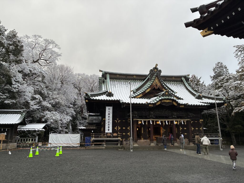 まだ明るかったので、雪化粧の三嶋大社まで散歩してみました。