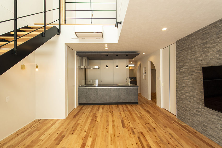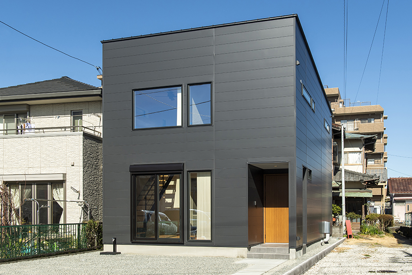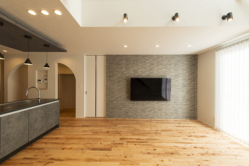 日々の暮らしの中でご家族との時間を多く確保するため、導線や収納を重視しています。例えばガス乾燥機や室内で干した衣類をすぐにしまえるファミリークローゼット。ダイニングの脇に配置した書籍やおもちゃなどの収納スペースなど。また、ご家族の様子がいつでも一望できるシンプルなLDKには、自然光が降り注ぐ開放的な吹抜けがあります。街なかの車や人通りの多い場所でも、心身ともに安心して暮らしていけるお宅です。