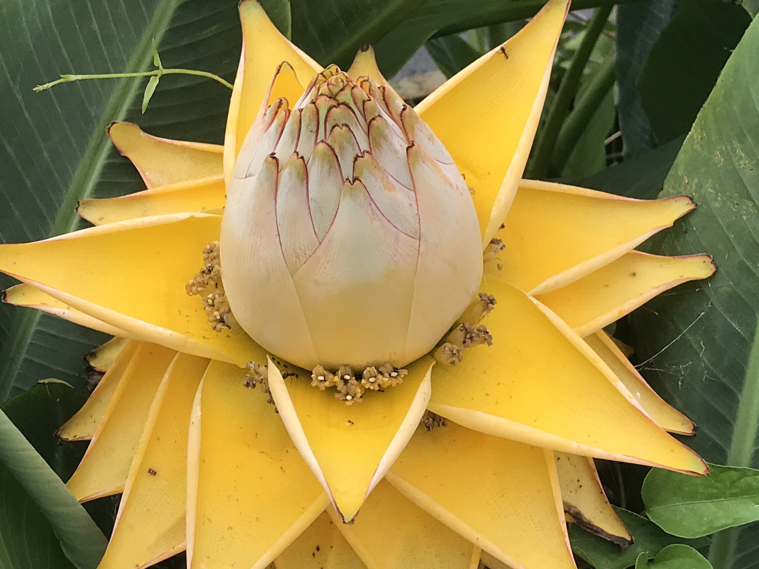 地湧金蓮(チユウキンレン)。名前の如く、水のない地面から湧き出た黄金の蓮の花のようです。芭蕉科でバナナの仲間らしく、大きな葉は芭蕉の葉に似ています。