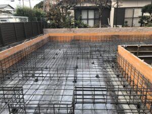 現在、基礎の配筋工事中です。