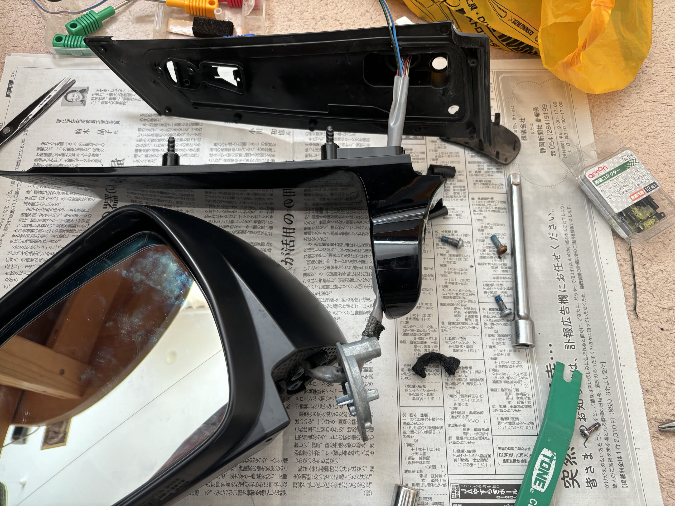 交換はミラーをドアミラーを外し、分解をして配線を2本通し、熱線入りのミラーに交換し、配線の1本をデフォッガーのスイッチの+12Vへ割り込ませて、もう1本はアースに繋げば配線は終わりです。