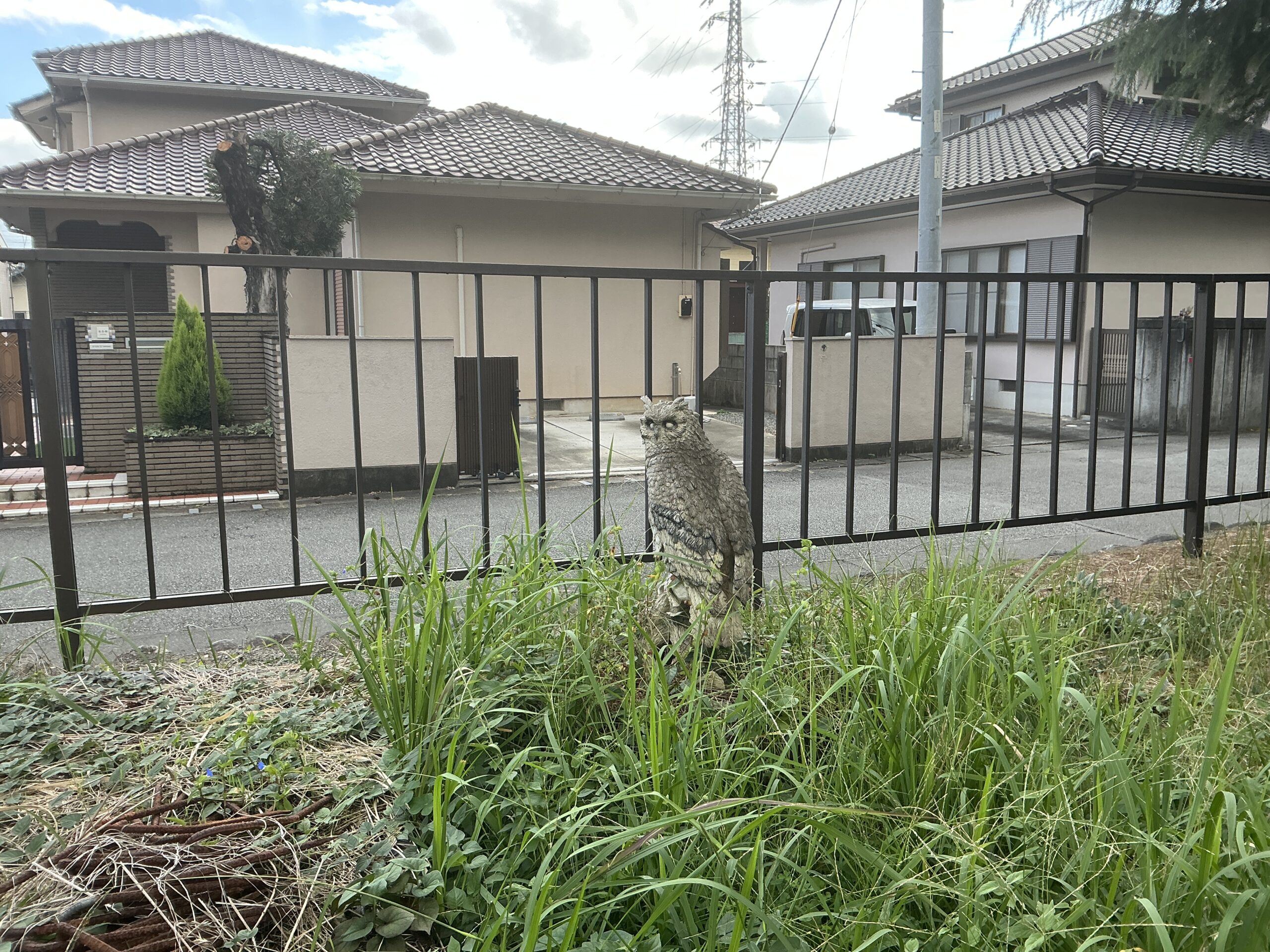 道路からは後ろ姿しか見えなかったため、正面に回ってみると、それがミミズクであることが分かりました。逃げないようにゆっくり近づいてみると、木彫りのミミズクではありませんか。本物だと思っていたので、少しがっかりしたのを覚えています。