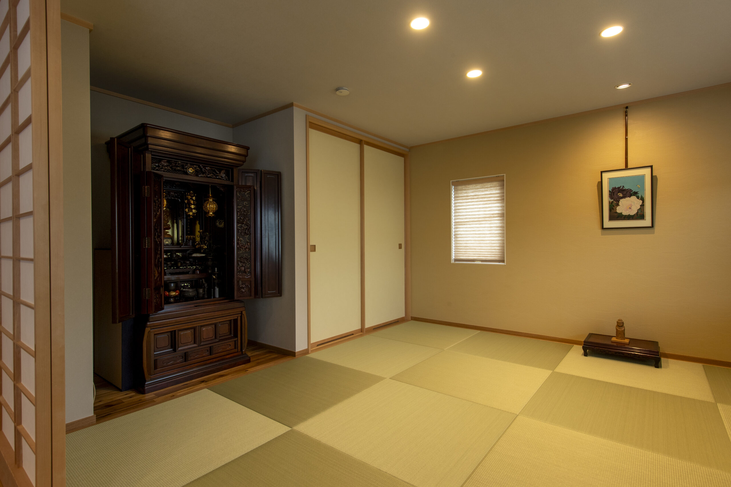 床下収納を有した一段上がった和室、趣味の版画や骨董を飾るスペースが随所にあり、