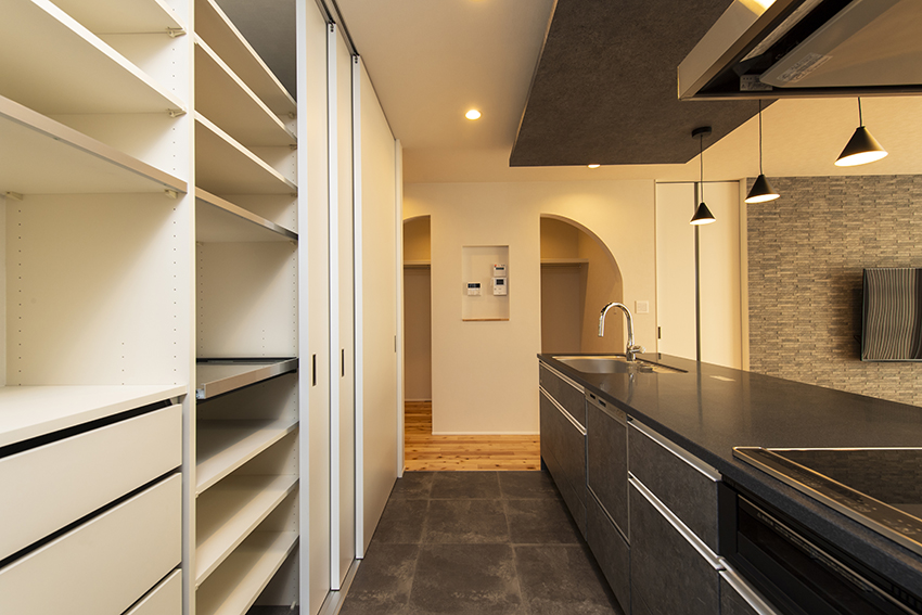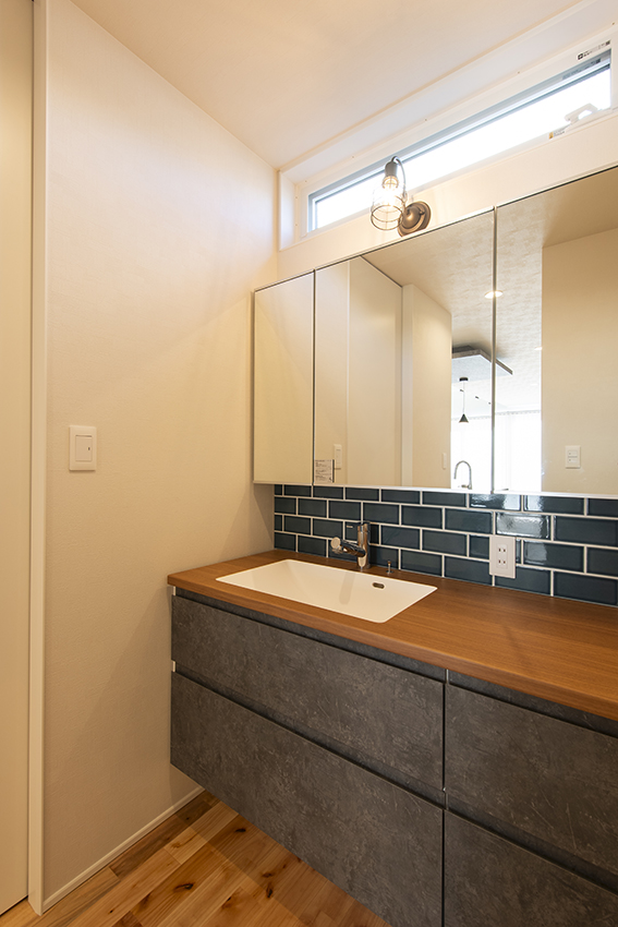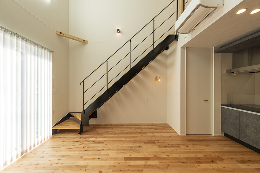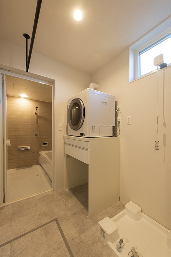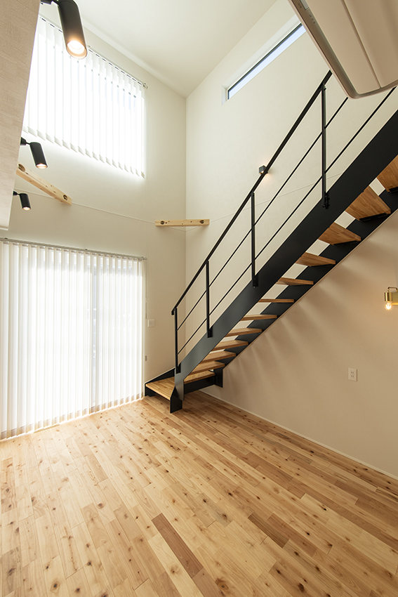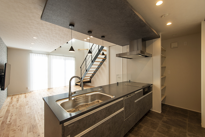 日々の暮らしの中でご家族との時間を多く確保するため、導線や収納を重視しています。例えばガス乾燥機や室内で干した衣類をすぐにしまえるファミリークローゼット。ダイニングの脇に配置した書籍やおもちゃなどの収納スペースなど。また、ご家族の様子がいつでも一望できるシンプルなLDKには、自然光が降り注ぐ開放的な吹抜けがあります。街なかの車や人通りの多い場所でも、心身ともに安心して暮らしていけるお宅です。